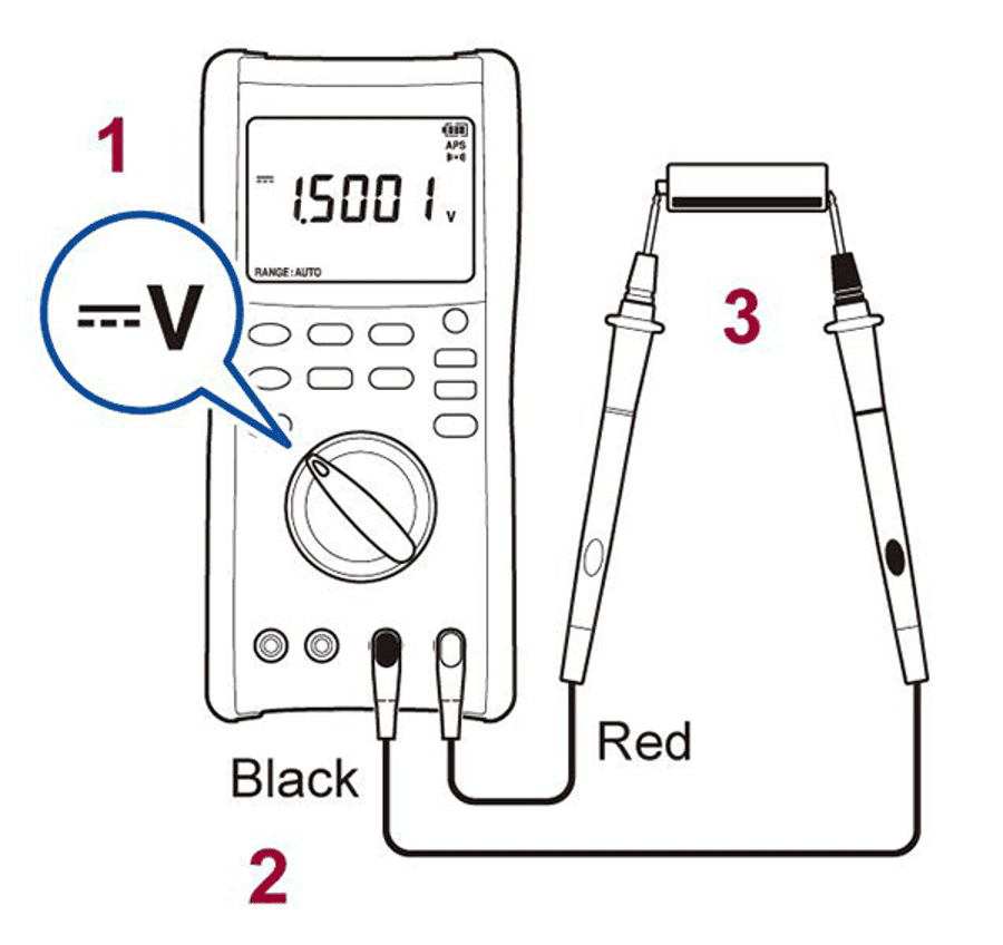 3. Підключення вимірювальних проводів до джерела постійної напруги: чорний до негативної сторони та червоний до позитивної сторони («3» на малюнку)