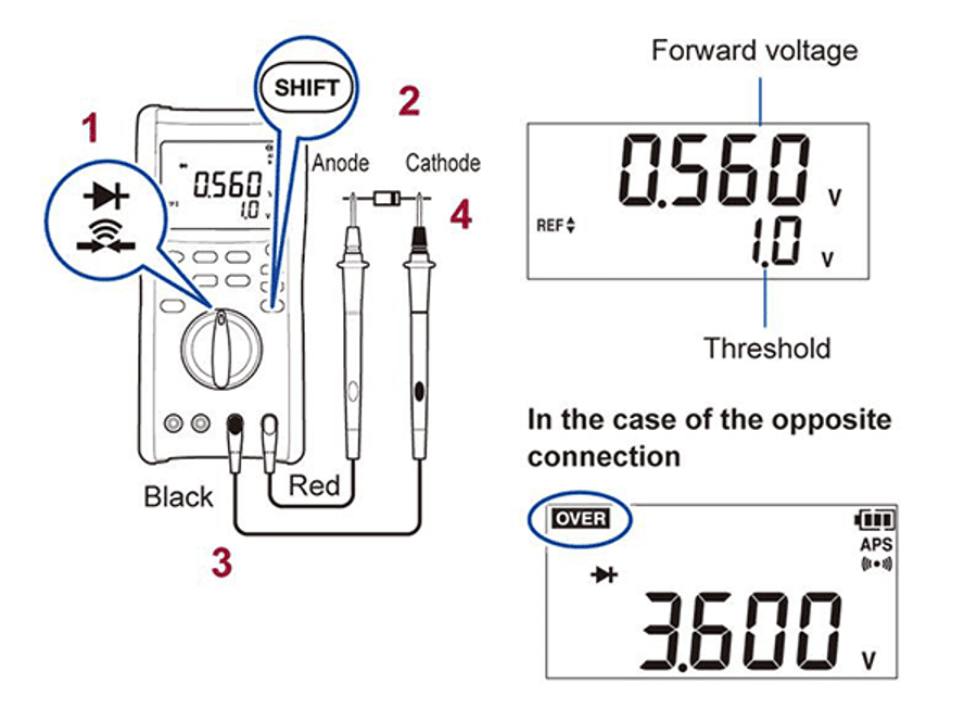 4. Підключення вимірювальних проводів до вимірюваного діода: чорний до катодної сторони (сторона з міткою смуги) та червоний до анодної сторони (сторона без мітки смуги) («4» на малюнку) Цифровий мультиметр покаже пряму напругу діода, якщо він підключений у прямому напрямку, та «OVER», якщо він підключений у зворотному напрямку.
