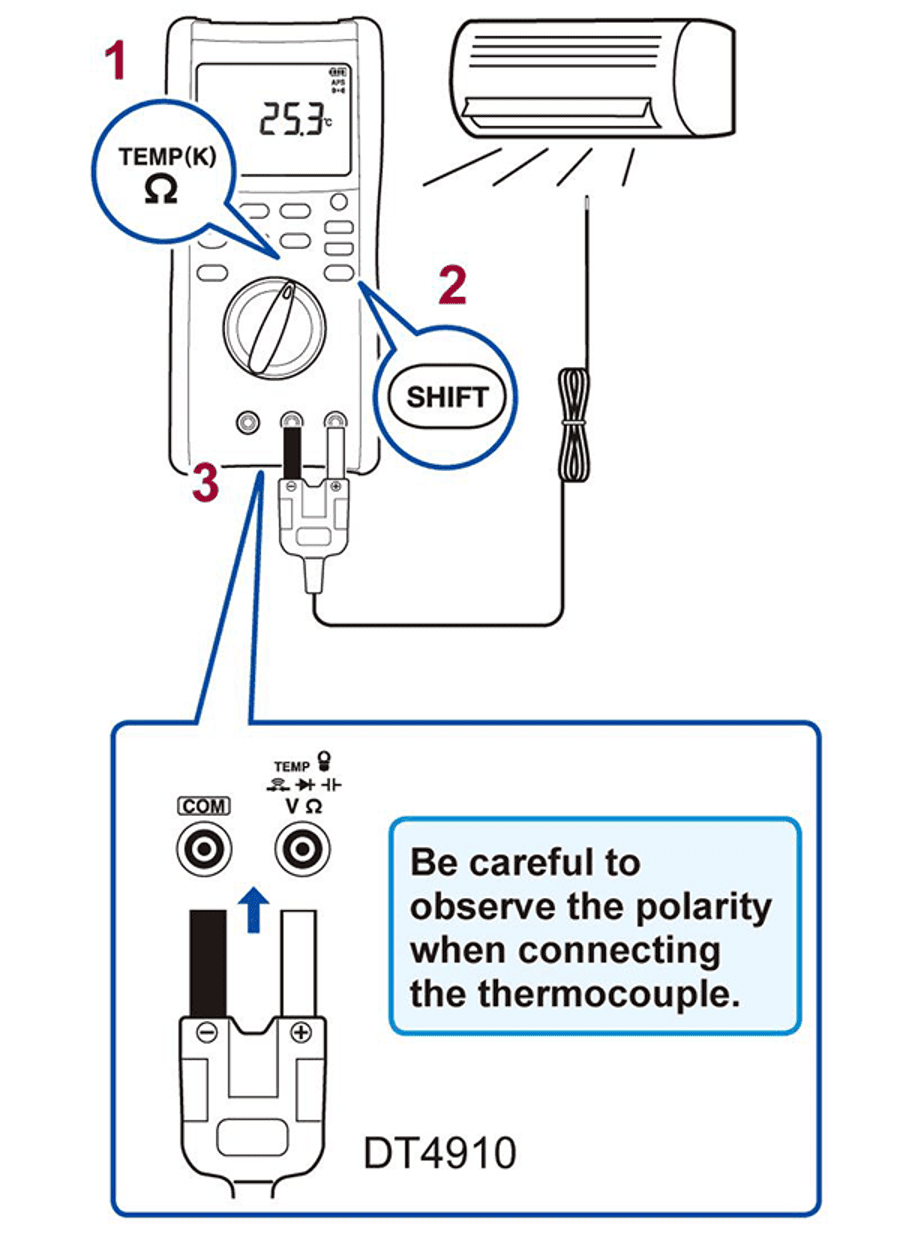 Для вимірювання температури, наприклад температури нагнітання кондиціонера, налаштуйте цифровий мультиметр таким чином: