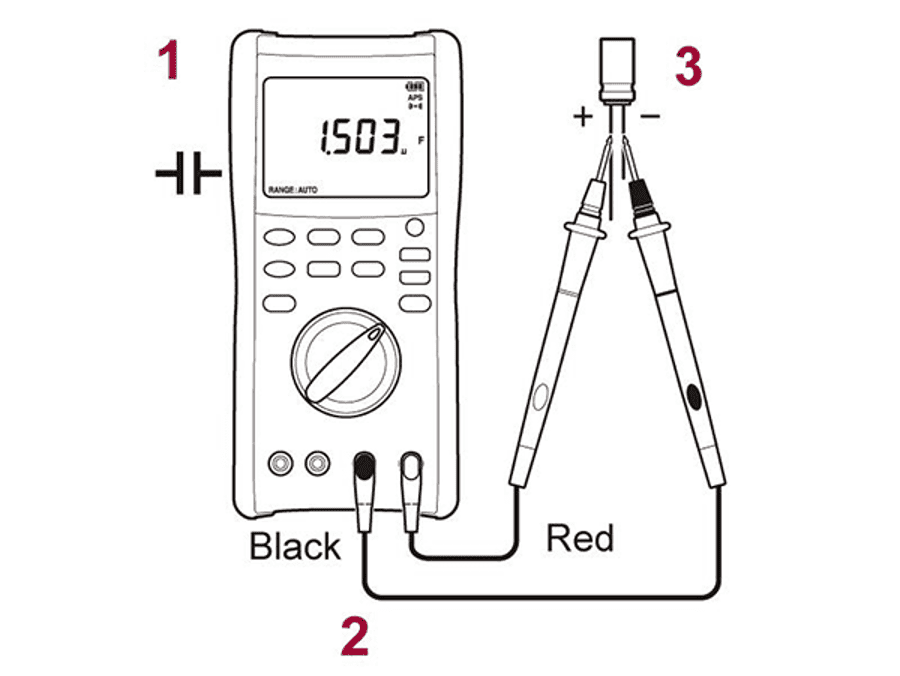 3. Підключення вимірювальних проводів до конденсатора: для полярного конденсатора червоний провід до позитивної клеми, а чорний провід до негативної клеми («3» малюнку)