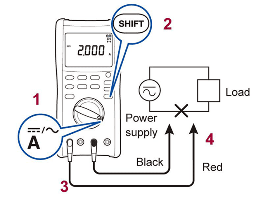 4. Підключення вимірювальних проводів до ланцюга: чорний до негативної сторони джерела живлення та червоний до сторони навантаження (так, щоб цифровий мультиметр був послідовно підключений до джерела живлення та навантаження) («4» на малюнку)