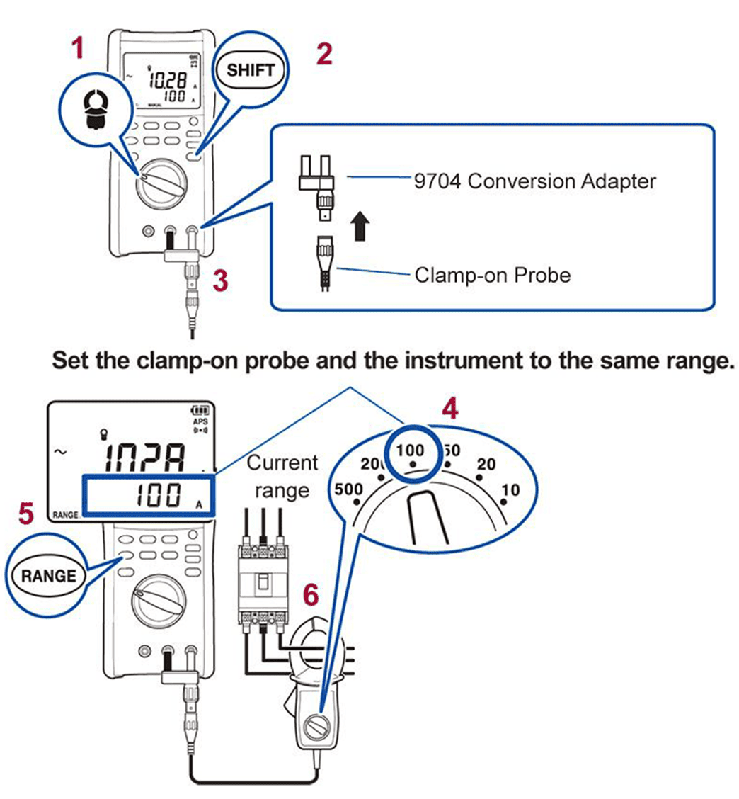 5. Налаштування діапазону цифрового мультиметра: «5» на малюнку (Встановіть за допомогою клавіші RANGE, щоб відобразити діапазон затискного датчика.)
