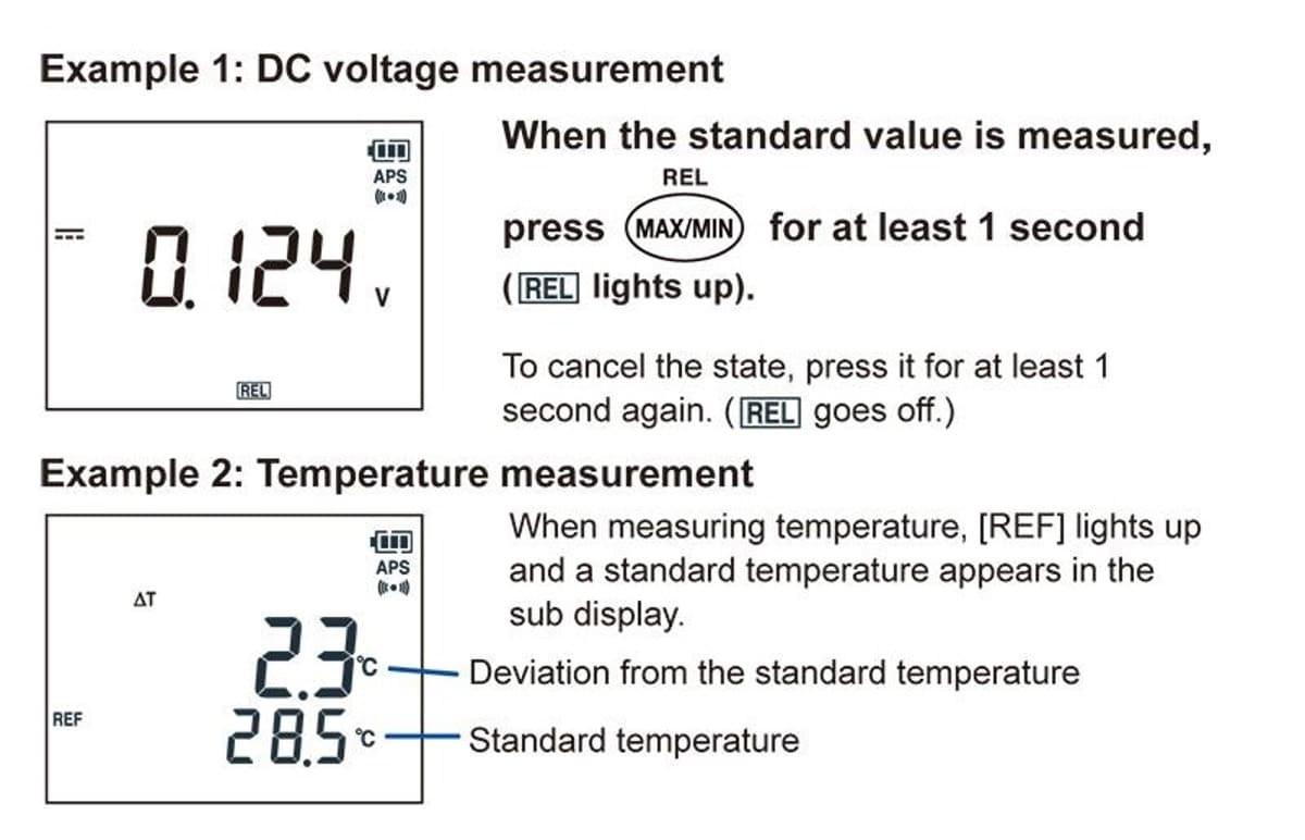 Функція відносного значення: Ця функція вимірює величину відхилення від опорного значення. (Натисніть та утримуйте клавішу MAX/MIN щонайменше 1 секунду.)