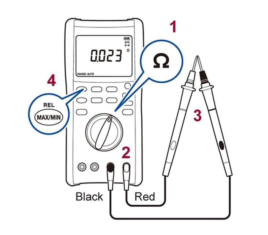 2. Підключення вимірювального дроту до цифрового мультиметра: чорний (негативний) до COM і червоний (позитивний) до VΩ («2» на малюнку)