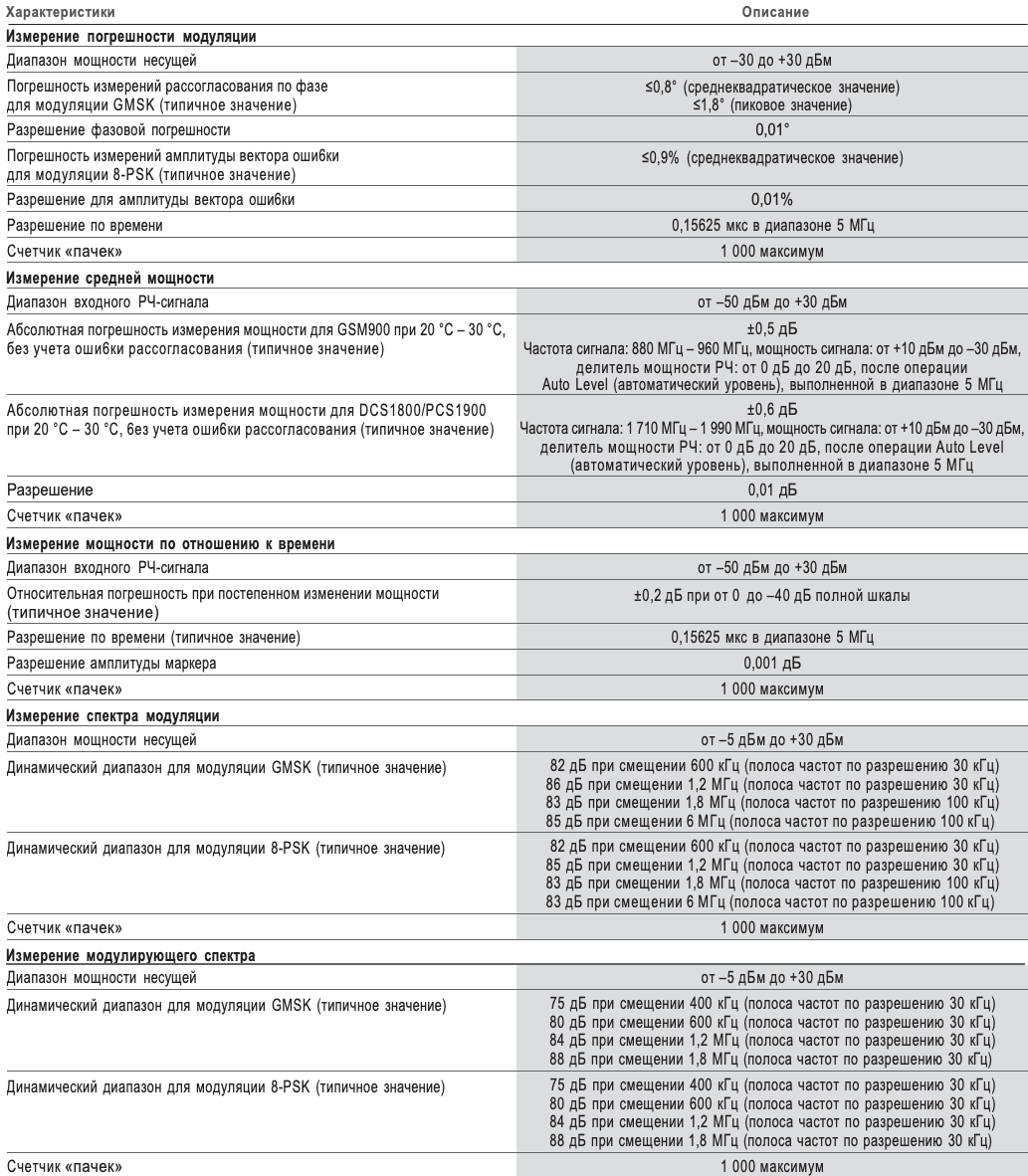 GMSK (діапазон 1 МГц) – модуль вектора помилки ≤1,8%; помилка амплітуди ≤1,2%; фазова похибка ≤1,0°. 64-позиційна квадратурна АМ 64QAM,