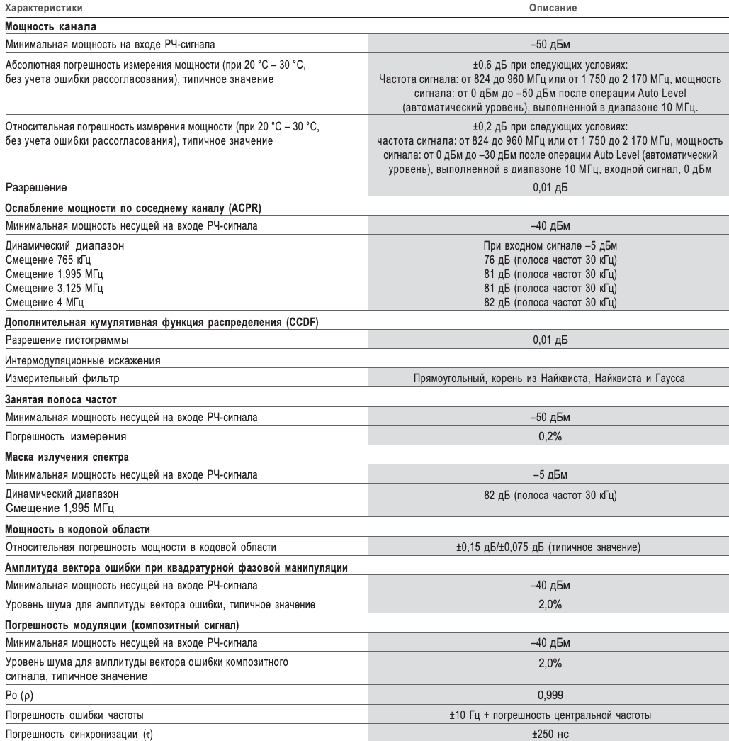 Виконує основні вимірювання для 3GPP TS34.121, включаючи можливості аналізу PRACH. Підтримує такі виміри – «сузір'я», амплітуда вектора помилки, «очкова» діаграма, таблиця символів, спектрограма CDP, CDP по відношенню до скороченого коду, CDP по відношенню до символу, CDP по відношенню до тимчасового інтервалу, «сузір'я» для символів, амплітуда вектор помилки для символів, «глазкова» діаграма для символів. Підтримує сигнали висхідного каналу зв'язку W-CDMA – DPDCH 9, виділений канал фізичних даних/DPCCH (виділений канал фізичної перевірки), PRACH (канал фізичних даних із довільною вибіркою), PCPCH (канал фізичних пакетів).