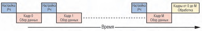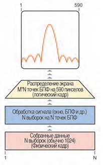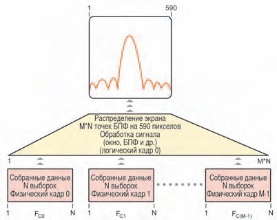 Рис.4-2 Стандартний режим аналізу спектра: зіставлення даних діапазонів, перевищують ширину смуги пропускання реальному масштабі часу. N вибірок для кожного фізичного кадру, M фізичних кадрів та 1 логічний кадр
