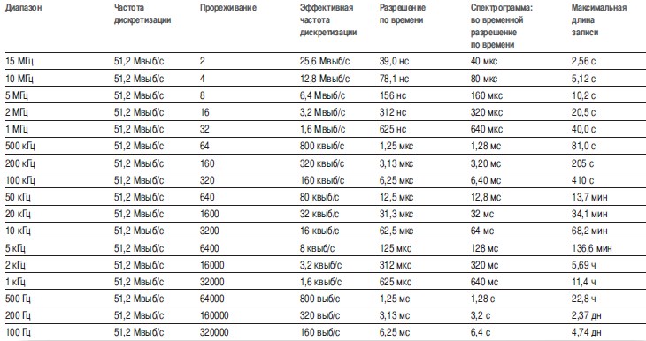 Як описувалося у розділі 3, від діапазону аналізатора спектра в реальному масштабі часу залежить ефективна частота дискретизації даних у часовій області, що зберігаються в пам'яті приладу. У таблиці 4-1 показано вплив збільшення та зменшення діапазону.