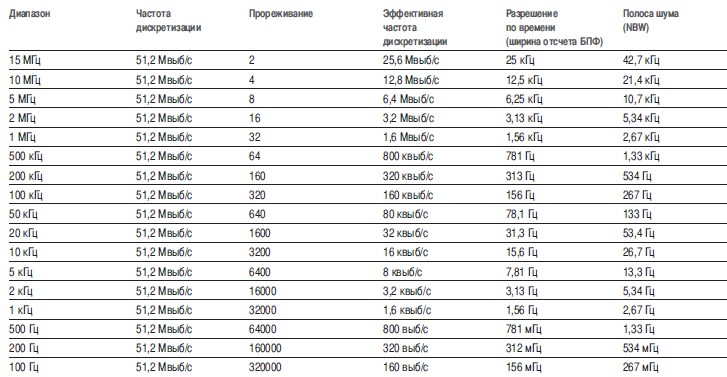 Процеси перетворення зі зниженням частоти і проріджування однаково сильно впливають на дозвіл аналізатора спектра в реальному масштабі часу частотної області. Роздільна здатність по частоті при виконанні вимірювань в реальному масштабі часу визначається шириною відліку БПФ і шириною смуги шуму для шумоподібних сигналів. У таблиці 4-2 показано вплив збільшення та зменшення діапазону.