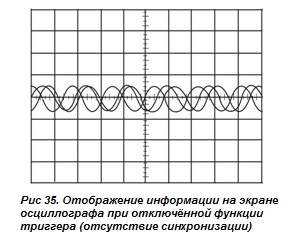 Функція запуску осцилографа (тригер) синхронізує горизонтальну розгортку у певній точці сигналу, що важливо для чіткої характеристики сигналу, що досліджується. Елементи управління тригером дозволяють стабілізувати сигнали, що повторюються, тим самим захоплювати і фіксувати поодинокі картинки. Тригер змушує повторювані осцилограми на дисплеї осцилографа здаватися статичними шляхом багаторазового відображення однієї й тієї ж ділянки вхідного сигналу. Уявіть хаос на екрані осцилографа, який неминуче виник би, якби кожен цикл розгортки починався в довільній точці сигналу, як показано на рис.
