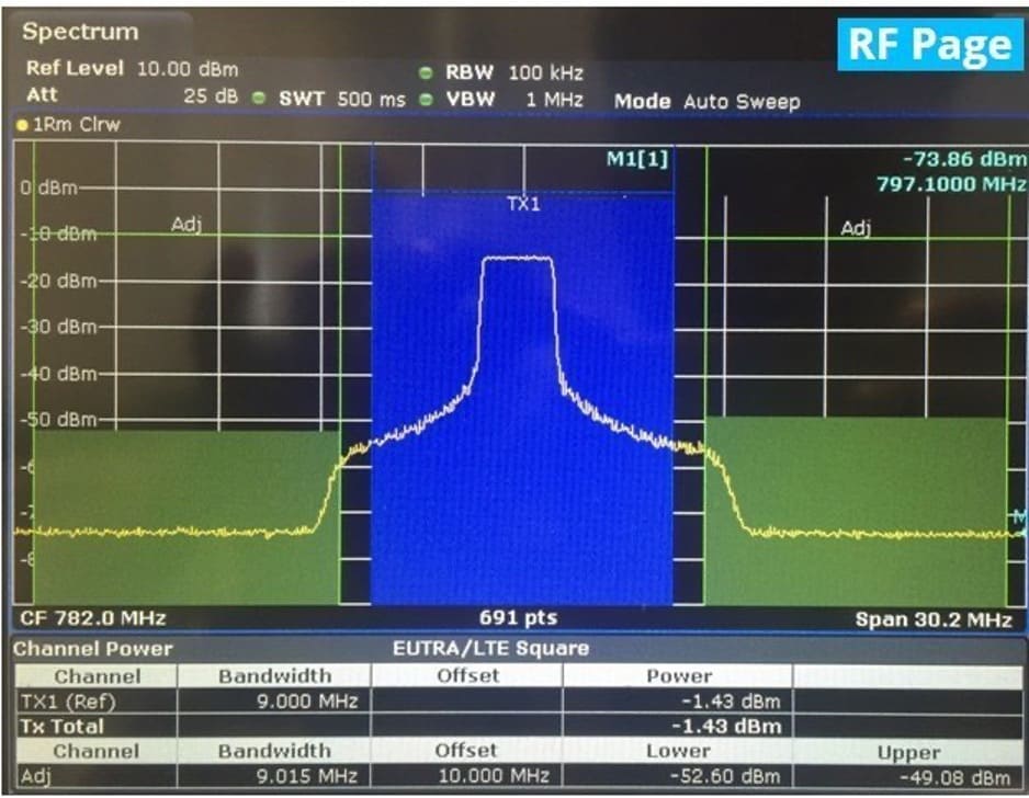 Аналізатор спектру часто є інструментом вибору, коли потрібні вимірювання спектру для забезпечення відповідності стандартам та правилам. Наприклад, у мобільному радіозв'язку аналізатор спектру є основним інструментом для вимірювання побічних випромінювань, коефіцієнта витоку в сусідній канал (ACLR) та масок спектрального випромінювання (SEM). Вимірювання SEM зосереджені на окремих шпорах, у той час як аналіз ACLR (рисунок 1) включає вивчення інтегрованої потужності в діапазоні частот сусідніх каналів сигналу зв'язку. Обидва вимагають виявлення надзвичайно малих сигналів у безпосередній близькості від сильного сигналу, що наголошує на необхідності динамічного діапазону та частотної селективності аналізатора спектра.