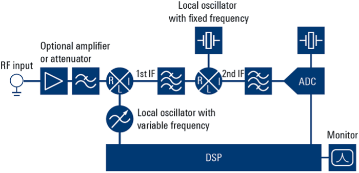 Сучасні аналізатори спектра оснащені обробки як цифрових, і аналогових сигналів. Ширина смуги вхідного сигналу зазвичай становить до 1 ГГц, деякі прилади можуть обробляти смуги до 8,3 ГГц. Вхідний каскад аналізатора (як показано на малюнку 2) перетворює сигнал зі зниженням частоти до низької проміжної частоти (ПЧ), дискретизує його за допомогою широкосмугового АЦП і, нарешті, перетворює його в цифровому вигляді зі зниженням частоти в основну смугу для вирівнювання. Отримані цифрові значення I/Q містять всю інформацію про сигнал у межах смуги пропускання та динамічного діапазону. Згодом сигнал може бути підданий подальшій обробці з використанням відповідних вимірювань, специфічних для конкретної програми. Такі вимірювання можуть бути доступні на пристрої або за допомогою програмного забезпечення для ПК, такого як R&S VSE (Vector Signal Explorer).