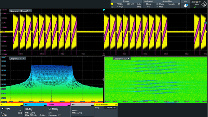 Однак, при тестуванні обладнання з частотними діапазонами за межами максимальної смуги пропускання осцилографа для отримання сигналів необхідний зовнішній змішувач. Осцилограф з деэмбеддингом у час може компенсувати втрати, викликані додатковими компонентами по дорозі сигналу. Хоча базові інструменти аналізу для часової та частотної області часто вбудовані (рис. 3), для поглибленого аналізу імпульсів та перехідних процесів може знадобитися спеціальний інструмент, такий як програмне забезпечення R&S VSE.