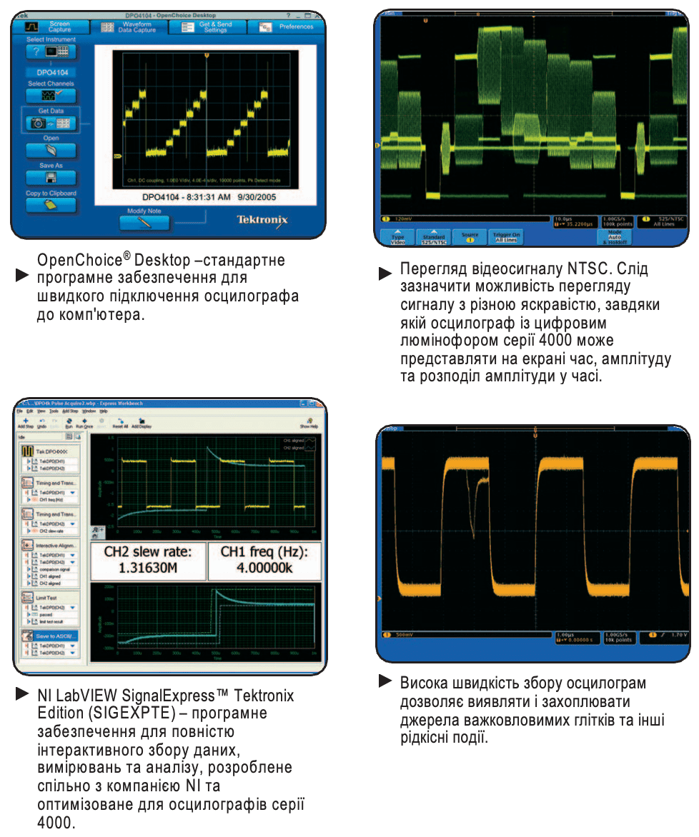 Такі стандартні засоби, як масштабні сітки IRE і «мВ», витримка по полях, полярність відеосигналу та автоустановка, здатна виявляти відеосигнали, роблять осцилографи серії 4000 найпростішими у використанні серед осцилографів для відеододатків, що є на ринку. Маючи смугу пропускання до 1 ГГц та чотири канали, осцилографи сімейства 4000 забезпечують цілком достатню швидкодію для застосування в аналоговій та цифровій відеотехніці.