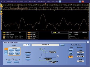 Швидке перетворення Фур'є (ШПФ) – для аналізу сигналу в частотній ділянці використовуйте вбудовану функцію спектрального аналізу. За допомогою елементів керування на передній панелі осцилографа можна безпосередньо контролювати діапазон частот, несучу частоту, опорні рівні та роздільну здатність смуги. Векторний аналіз сигналів, перевірка та визначення характеристик надширокосмугових сигналів (UWB) доступні як опції SignalVu та UWB.