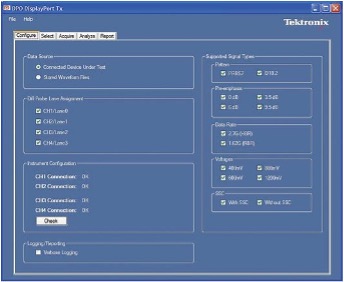 Перевірка на відповідність стандарту DisplayPort (опція DSPT) підтримує перевірку з одночасним тестуванням по чотирьох каналах за допомогою пробників серії Tektronix P7300SMA та програмного забезпечення DisplayPort. Дана опція включає можливість складання звітів про перевірку з осцилограмами, результатами перевірки на відмову і тестування по масці.