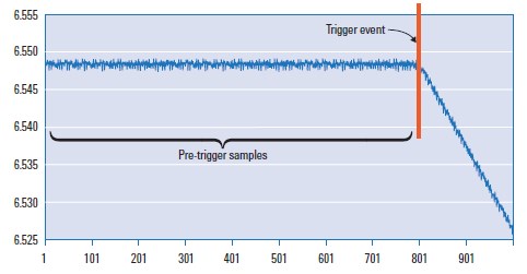 Іншою, дуже корисною функцією при оцифровуванні або реєстрації даних є здатність приладу акумулювати елементи вибірки до та після події тригера. Наприклад, якщо ви використовуєте цифрові мультиметри Agilent 34411A і L4411A, є можливість виставити кількість елементів вибірки до спрацювання тригера, тобто. параметри вибірок, таким чином, можуть зберігатися до моменту захоплення. У результаті з'являється можливість дослідження поведінки об'єкта, що тестується, безпосередньо до і після проходження цікавої події. рис. 2