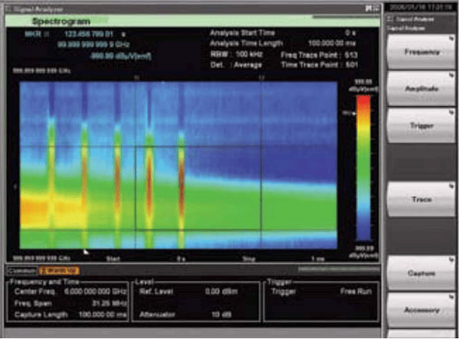 Рисунок 3 - Функція спектрограми аналізатора сигналів представляє 3 розмірну картинку сигналу LTE. Вертикальні курсори дозволяють користувачам вибирати окрему ділянку даних у тимчасовому домені, а горизонтальні курсори дають можливість фіксувати для аналізів частоту, що цікавить (матеріали люб'язно надані компанією Anritsu)