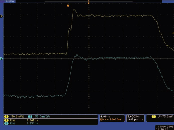 На верхній осцилограмі (канал 1) видно наростаючий фронт тривалістю 1,3 нс, захоплений осцилографом DPO4000 при смузі 1 ГГц. Нижня осцилограма (канал 2) ідентична верхній, але смуга пропускання тут обмежена до 250 МГц; таке зображення з'явилося б на 250-МГц осцилографі. Відображення сигналу маскується через недостатньо широку смугу пропускання. (Зауважимо, що недостатня ширина смуги пропускання призводить до похибок вимірювання часу наростання сигналу.)