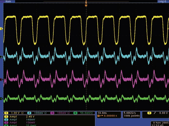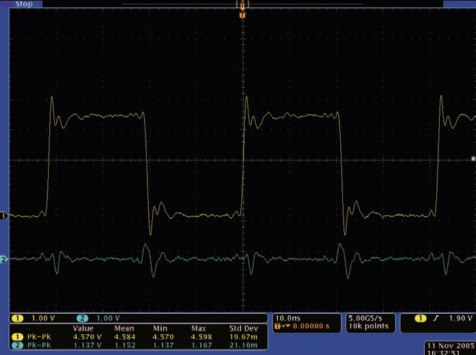 На рис. 2 в каналі 1 зареєстрований сигнал з одного з виходів чотиривіркової мікросхеми логічного 74LVC00. На один із входів кожного з трьох елементів І чотиривіркової мікросхеми подано напругу живлення +3,3, а один вхід четвертого елемента І заземлений. На чотири входи мікросхеми, що залишилися, подано сигнал частотою 48 МГц. На канал 2 подається сигнал четвертого логічного елемента, який не перемикається. Через коливань у шині заземлення на каналі 2 з'являються перешкоди розмахом трохи більше одного вольта. Аналіз сигналу в каналі 2 показує, чому коливання, відповідні спадаючому фронту сигналу в каналі 1 більше коливань, що відповідають наростаючому фронту в цьому каналі.