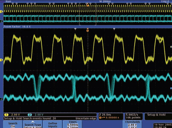 Рис. 4. Функції пошуку та встановлення маркерів в осцилографі DPO4000 у поєднанні з синхронізацією з порушенням часу встановлення та фіксації. Усі порушення часу встановлення та фіксації відзначені білими незаповненими трикутниками у верхній частині екрана; задані користувачем величини часу встановлення та фіксації дорівнюють відповідно 5,5 нс і 4,5 нс