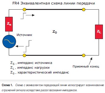 З'єднання сприймається як лінія передачі у разі, коли поширення сигналу лінії і назад займає більше часу, ніж завершення переходу (коли 2Tprop > Trise). Для типової плати матеріалу FR4 швидкість поширення сигналу приблизно дорівнює 15 см/нс. При часі наростання сигналу 1нс ефекти довгої лінії виявляються на будь-якій доріжці довше 7 см. Сигнали на передавальному та приймальному кінцях лінії часто розрізняються через відображення та «дзвін». При вимірі таких швидких сигналів важливо розмістити пробник на приймальному кінці лінії (схема 1).