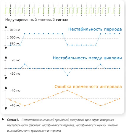 Є три типові способи вимірювання нестабільності фронтів по осцилограмі: нестабільність періоду, нестабільність між циклами та нестабільність часового інтервалу. а часовій діаграмі (схема 5) показано, як співвідносяться між собою ці виміри.