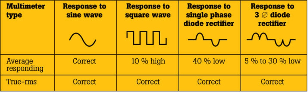 Див. нижче таблицю, в якій наводяться тип мультиметра (середні показники і true RMS), реакція приладу на синусоїдальну, квадратичну форми сигналу, реакція на однофазний і 3-х фазні діодні випрямлячі
