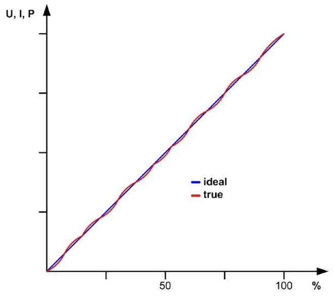 На жаль, відхилення фактичного значення від встановленого перестав бути постійним у всьому діапазоні вихідних значень 0...100%. Фактично, вихідне значення з його похибкою є нелінійною кривою (див. малюнок вище).