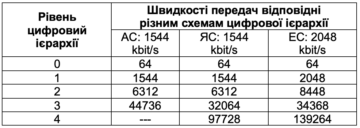 Зазначені ієрархії, відомі під загальною назвою цифрова плезіохронна ієрархія PDH, або ПЦІ, зведені в таблицю 1.
