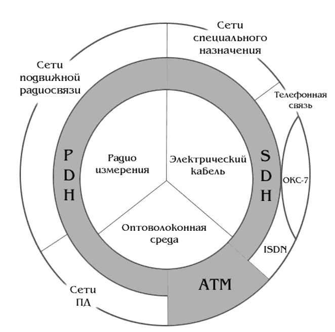 Розглянемо ту частину первинної, що з передачею інформації у цифровому вигляді. Як видно із рисунку 1, сучасна цифрова первинна мережа може будуватися на основі трьох технологій: PDH, SDH та ATM.