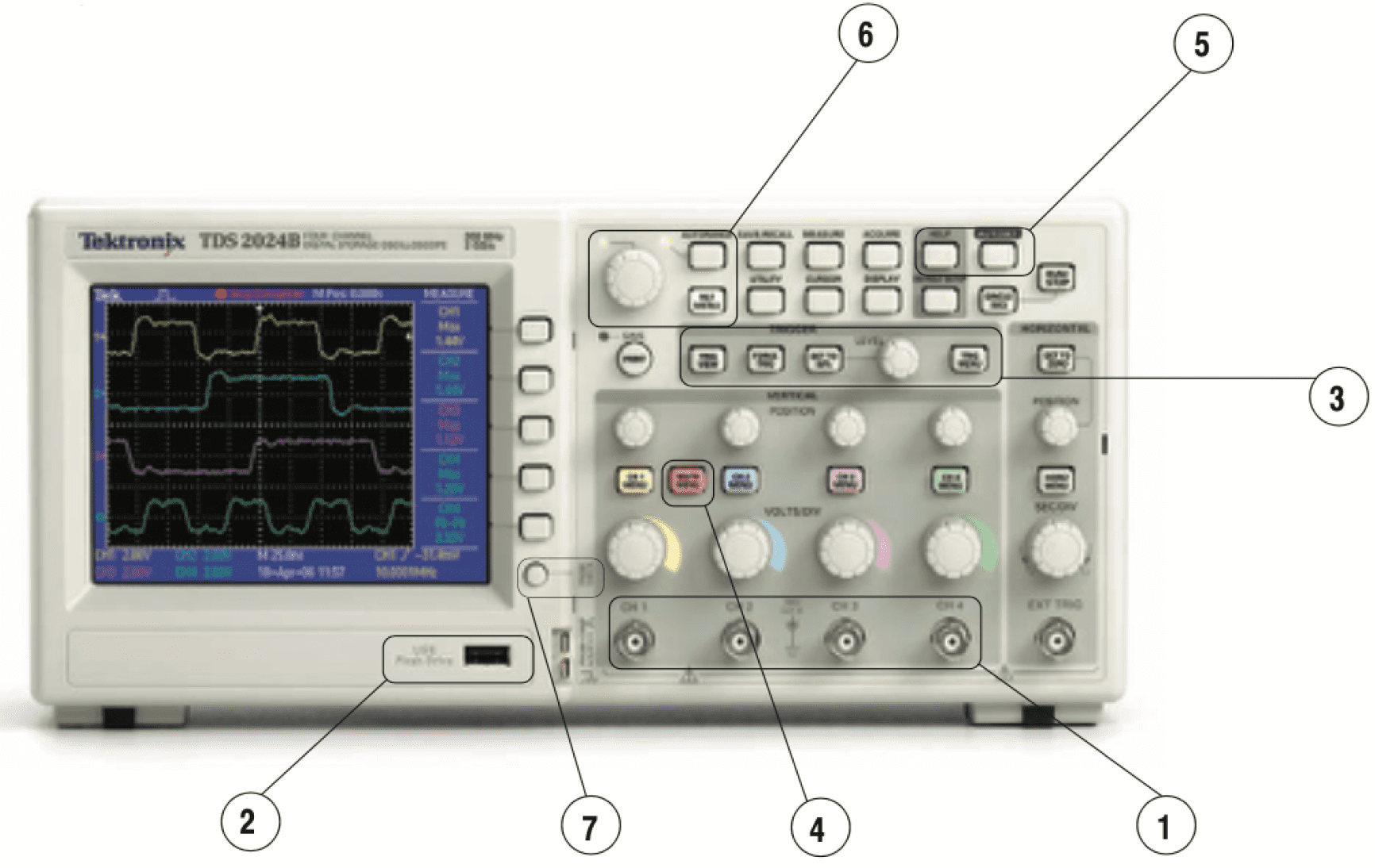 2. Основний порт USB – зазвичай використовується для під'єднання USB-пристрої, призначеного для зберігання налаштувань осцилографа, знімків екрана і даних осцилограми для подальшого використання. Крім того, основний порт USB використовується при оновленні мікропрограмного забезпечення приладу.