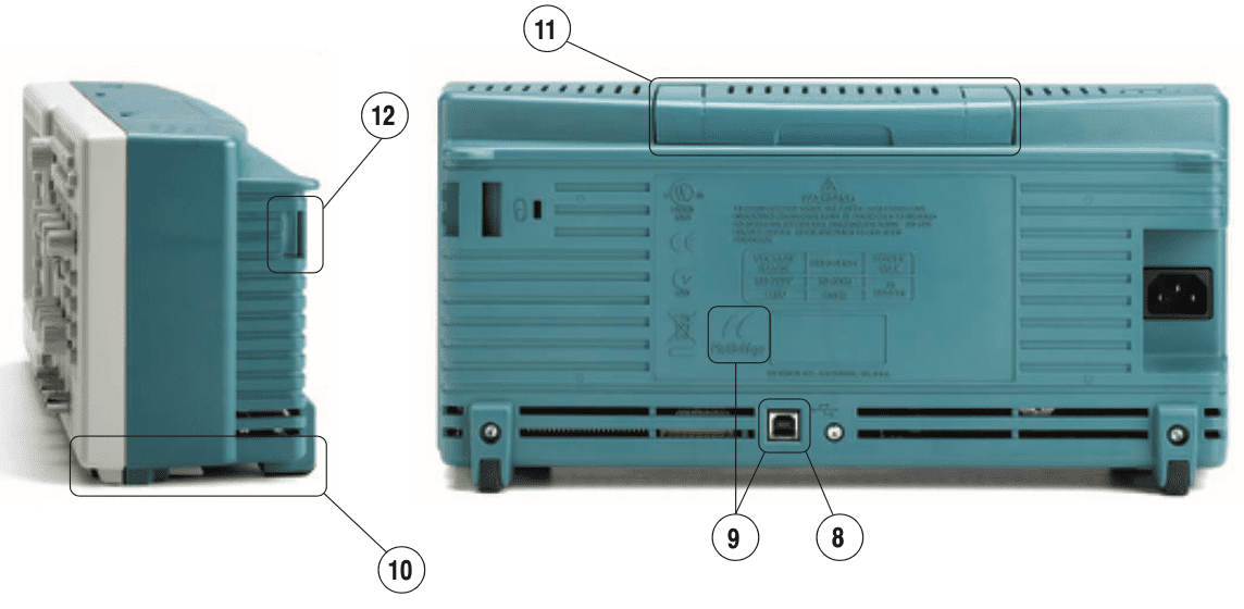 12. Вбудований вуш і замок Kensington Lock – служать для кріплення осцилографа на місці в разі потреби. Проріз під замок Kensington або трос (для захисту від крадіжок).