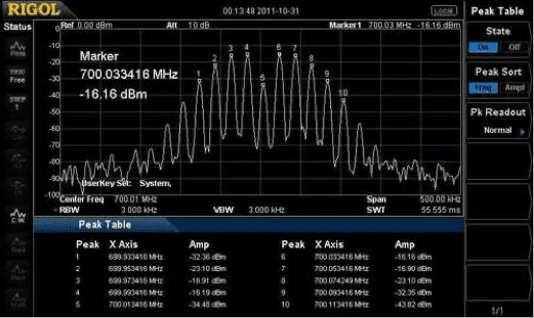 Рисунок 12. DSA815 може автоматично відображати десять верхніх піків випромінювання. Фото надане Rigol Electronics.