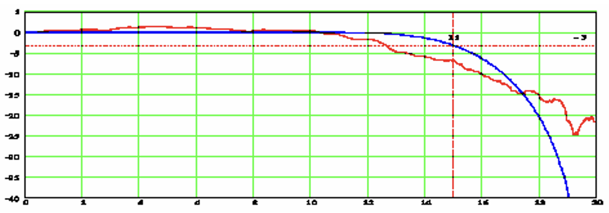 В ідеалі АЧХ осцилограф має бути плоскою на всіх частотах починаючи з постійного струму і до найбільшої робочої частоти, а потім мати плавний спад. Вихідна АЧХ аналогової частини, показана на рисунку 1 червоною лінією, відповідає цим вимогам в діапазоні частот до 12 ГГц. Оскільки вихідна АЧХ залежить від роботи DSP, на частотах до 12 ГГц можна використовувати будь-які частоти вибірки, а чи не лише 40 Готсч/с, тобто. максимально можливі для цього осцилографа. Однак сплощення АЧХ і фазова корекція за допомогою DSP, результат роботи якого показані на тому ж малюнку синьою лінією, забезпечують кілька переваг щодо реальних високочастотних сигналів.