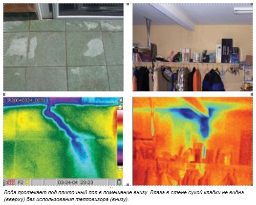 Тепловізор має здатність виявити вологу, що затрималася під кількома шарами матеріалів і не вийшла на поверхню, у тому числі у випадках, коли поверхня абсолютно суха, покрита фарбою, настилом або іншою обробкою. Як би там не було, тепловізор не є вологоміром і відповідно не бачить вологу.