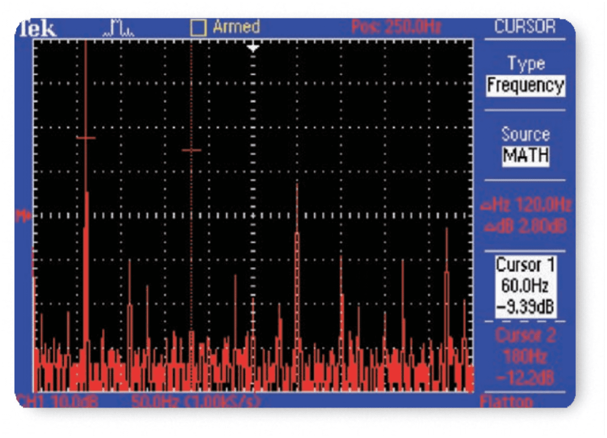 Проектувальникам силових ланцюгів часто необхідно аналізувати дію ланцюгів лінії живлення. Незважаючи на те, що ідеальне джерело живлення повинне забезпечувати постійне навантаження на лінії, у реальних ланцюгах живлення це неможливо, оскільки на лінії живлення створюються гармоніки. Осцилографи TDS1000B та TDS2000B дозволяють легко виміряти струм джерела живлення та проаналізувати гармоніки на лінії живлення.