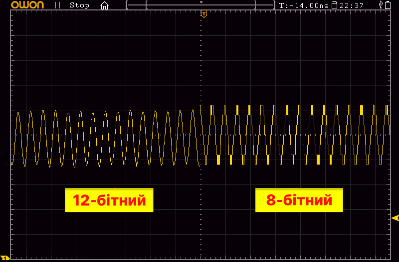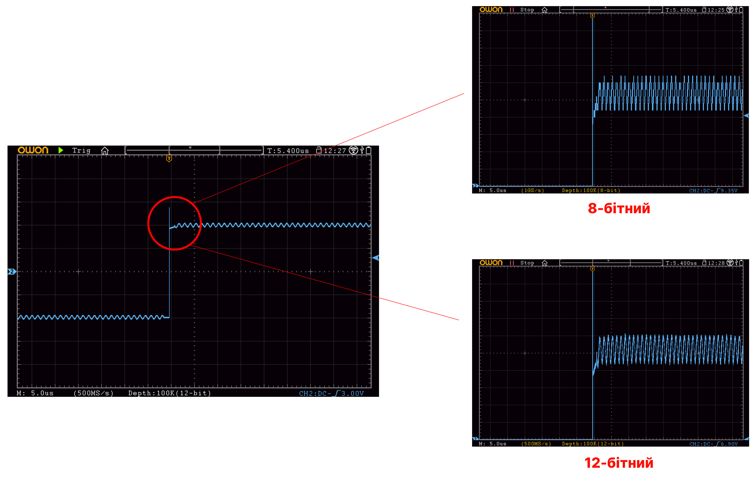 При тій самій формі сигналу 12-бітний АЦП може відображати більш докладну форму, в той час як 8-бітний АЦП форма сигналу стає розмитою.