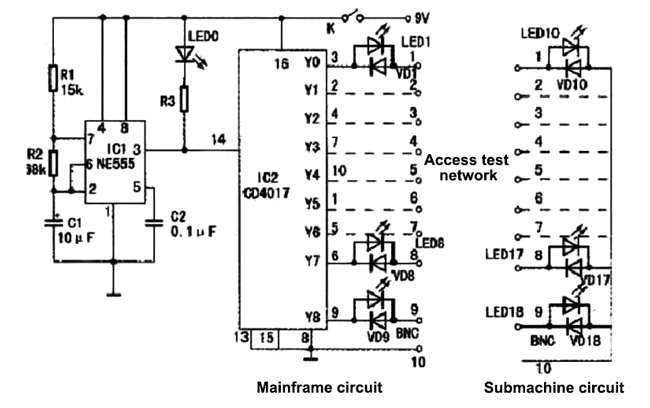 У цій схемі мікросхема IC1 обрана як NE555, а мікросхема IC2 як CD4017. Як LED0 використовується червоний світлодіод діаметром 5 мм, а як LED1–LED18 — зелені світлодіоди діаметром 3 мм. Крім того, для зручності підключення до тестового мережного кабелю слід підготувати два роз'єми RJ45. Джерело живлення – 9-вольтова батарея. Особливих вимог щодо інших компонентів немає.