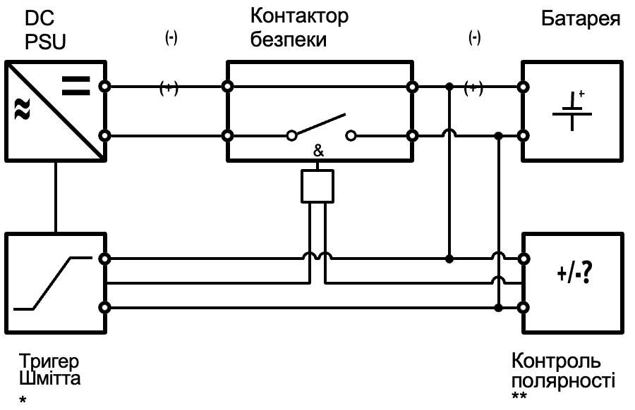 Автоматичні промислові зарядні пристрої акумуляторів (наприклад, серія автоматичних зарядних пристроїв EA-BCI) мають функцію перевірки помилкової полярності. Вищезгадана випробувальна установка також має її містити. При підключенні BUT (тестованої батареї) до такої випробувальної установки або зарядного пристрою серії EA-BCI вихідне реле перебуває у стані ВИМК. І випробувальна установка, і BCI потім виконують такі дії: