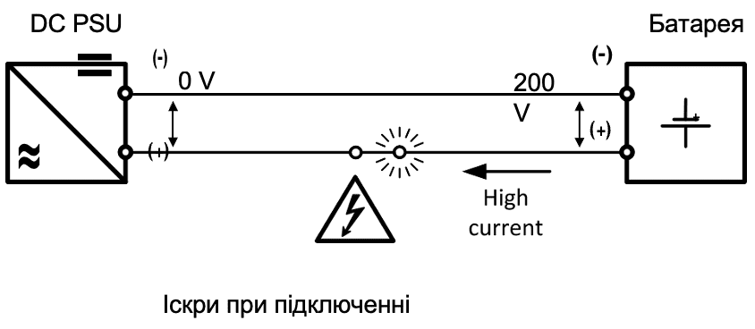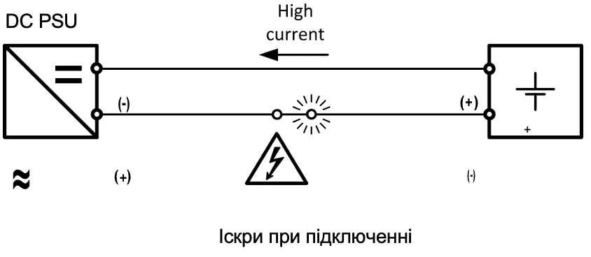 Примітка: джерело живлення постійного струму з імпульсним режимом має дуже енергетичну ємність на виході, виступаючи як вихідний фільтр. Якщо цей фільтр розряджений і до нього безпосередньо підключена батарея, результатом буде раптовий розряд високої енергії з батареї на фільтр, що згодом викличе сильну іскру (див. рисунок 4). Тільки якщо виявлено правильну полярність та рівні напруги джерела постійного струму та ПЗ були вирівняні, вихідне реле буде встановлено у стан ВКЛ і згодом підключить джерело постійного струму до батареї, що дозволить ініціювати процес зарядки.